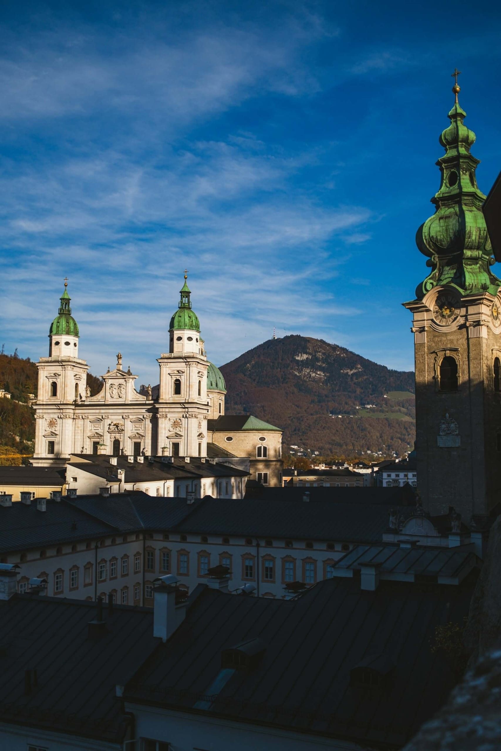 Salzburg liegt am Fuße der Alpen. Von den Aussichtsplattformen haben Sie einen Panoramablick über die Dächer der Altstadt und die Festung Hohensalzburg.